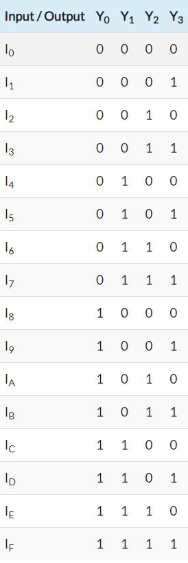 十六進(jìn)制到二進(jìn)制編碼器包含16條輸入線和4條輸出線。因此,提供的輸入顯示十六進(jìn)制計(jì)數(shù),輸出表示二進(jìn)制值。