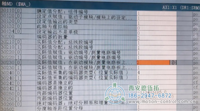 對(duì)于這臺(tái)機(jī)床,我們可以看到,第一個(gè)測(cè)量系統(tǒng)是主動(dòng)編碼器,30230的第0位是第一測(cè)量系統(tǒng),值為2,即驅(qū)動(dòng)器中的X421接口,X421界面連接到網(wǎng)格尺。但點(diǎn)陣尺是主動(dòng)編碼器,電機(jī)編碼器是從動(dòng)編碼器!這樣您就知道主動(dòng)(驅(qū)動(dòng))編碼器中是否存在硬件故障!